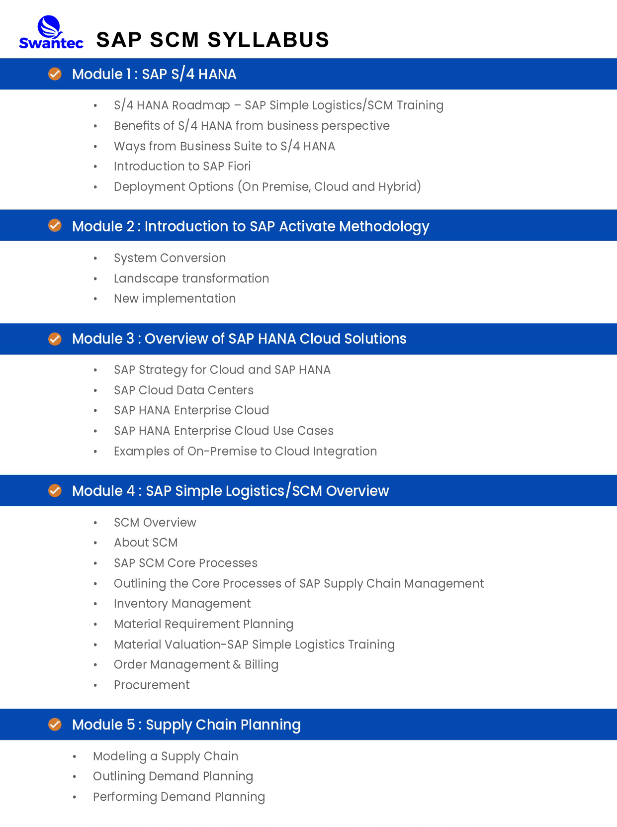 Swantec Academy’s SAP S/4HANA Supply Chain Management (SCM) training program is designed to equip professionals with the skills and insights needed to manage end-to-end supply chain processes using SAP’s next-generation ERP platform. This course provides hands-on experience with the latest tools, applications, and functionalities of SAP S/4HANA that support real-time, data-driven supply chain planning and execution.